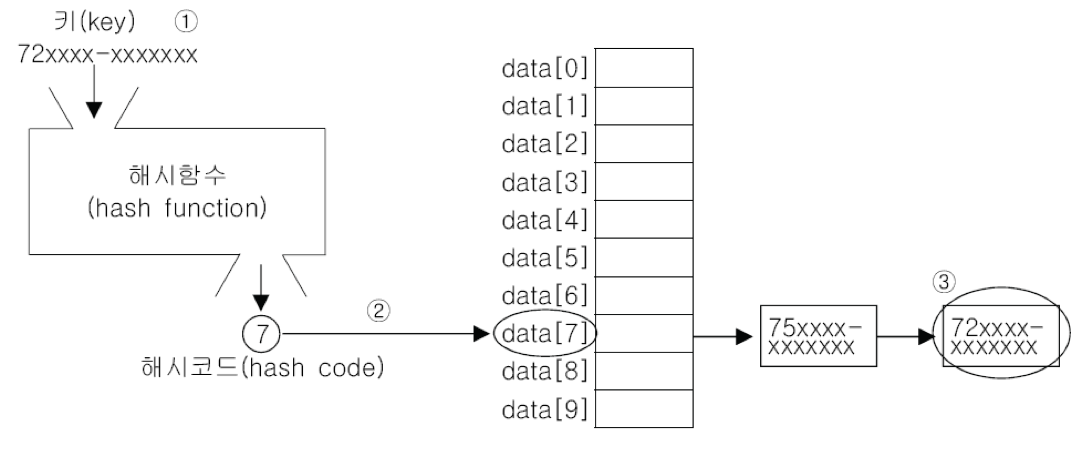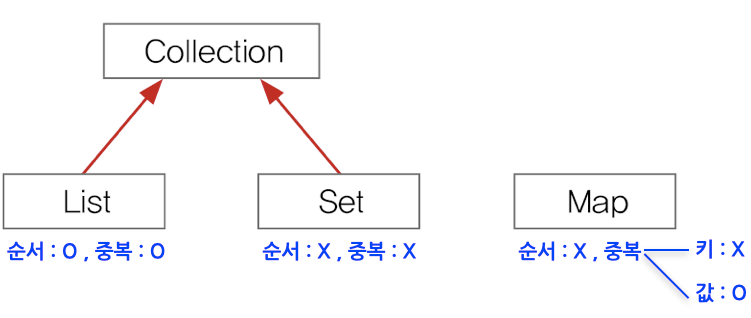 | Map | 키(key)와 값(value)의 쌍(pair)으로 이루어진 데이터의 집합 순서는 유지되지 않으며, 키는 중복을 허용하지 않고, 값은 중복을 허용한다. 예) 우편번호, 지역번호(전화번호), 아이디와 패스워드 |