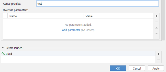 - Active profiles를 test로 지정한 다음 [Apply] – [OK]를 클릭 한다.